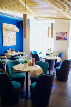 Интерьер dj-кафе МусКус, расположенного на проспекте имени Кирова в Саратове. В процессе проектирования нами были разработаны не только решения по отделке и наполнению интерьера, но и изготовлены элементы мебели и декора: потолочные светильники "тубусы", декоративные панно и вешалки. Эти изделия мы запустили в серийное производство и их можно приобрести в нашем интернет-магазине